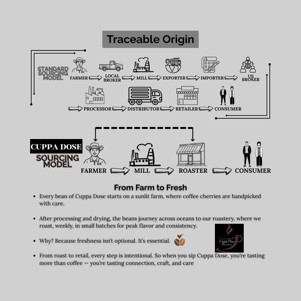 From handpicked cherries to small-batch roasting, this flowchart traces the radiant journey of every Cuppa Dose bean — crafted with care, calibrated for freshness, and delivered with intention.